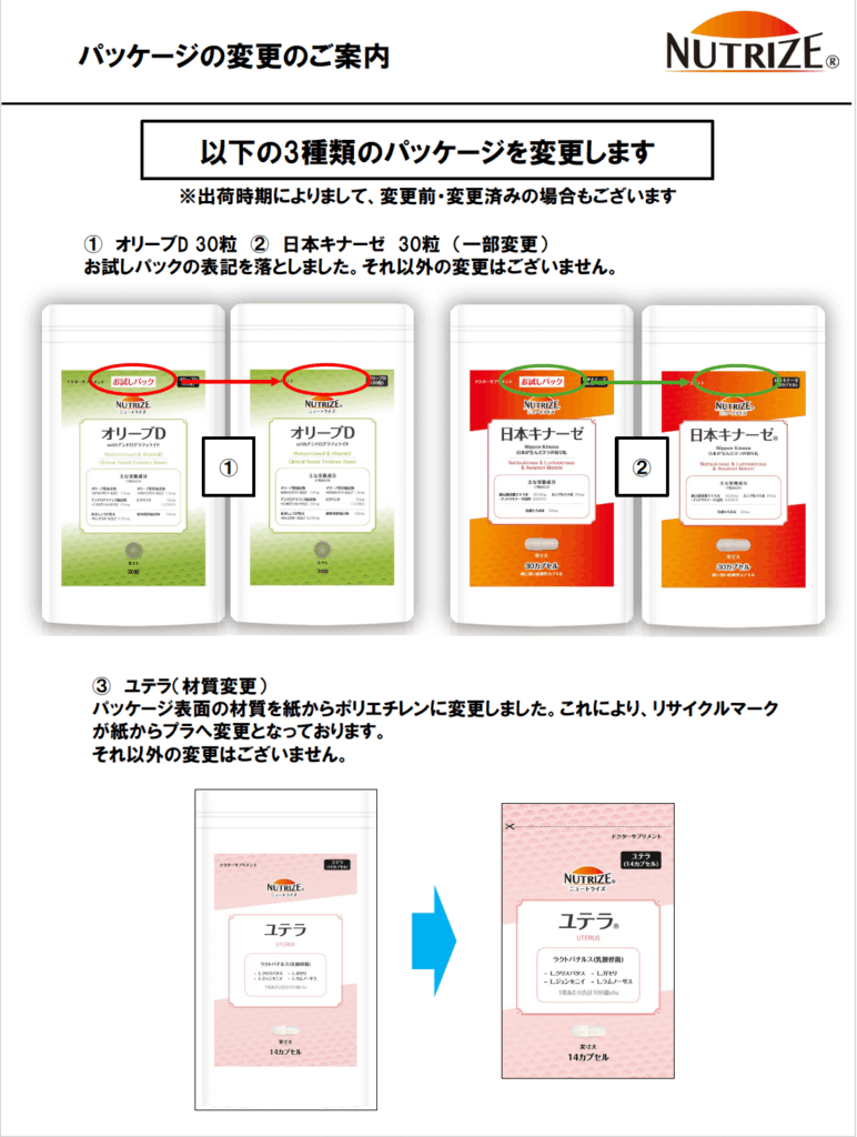 一部製品パッケージ変更のお知らせ(オリーブD・日本キナーゼ・ユテラ) 2026.01.05 お知らせ 平素は格別のお引き立てを賜り、厚く御礼申し上げます。 このたび、以下3製品につきましてパッケージデザイン・仕様の一部を変更いたしました。・オリーブD (30粒)・日本キナーゼ (30カプセル)・ユテラ(14カプセル) いずれも配合成分や内容量に変更はございません。詳細は添付のご案内をご確認くださいますようお願いいたします。